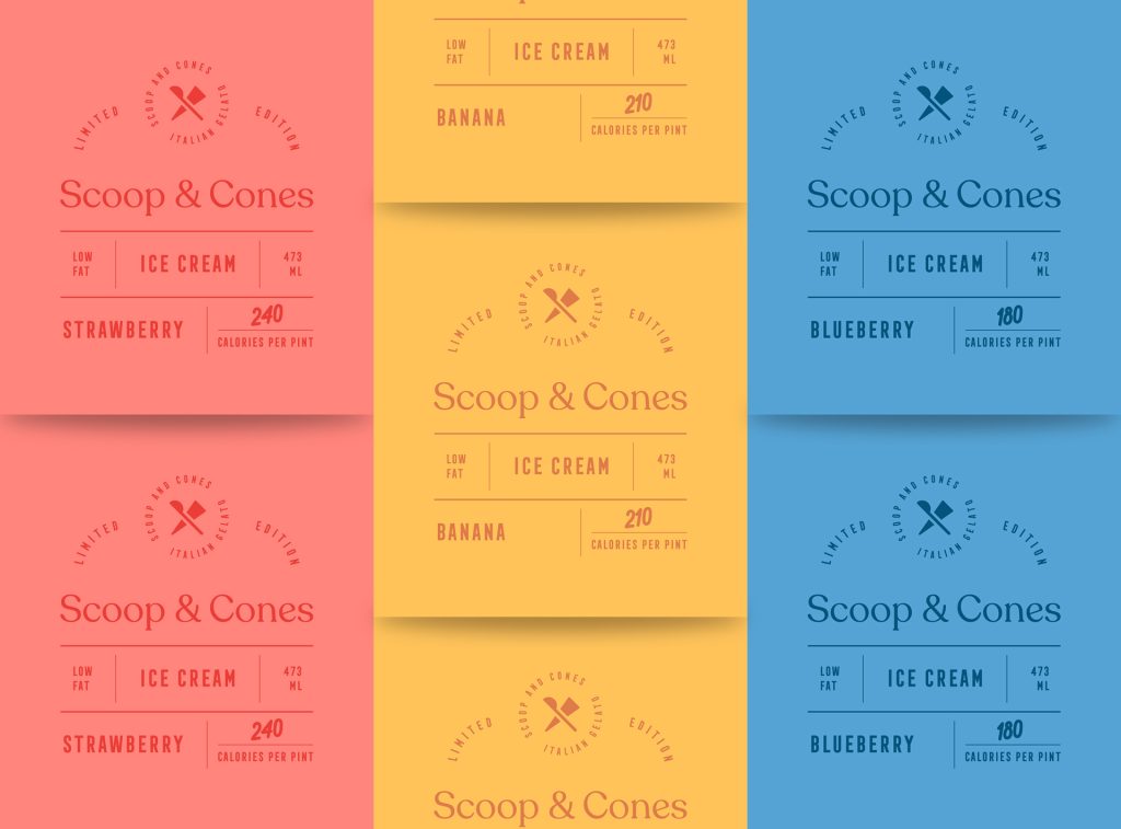 The logotype’s font choice fell on the sans serif type. Due to its simplicity and the brand’s vibrant branding, we wanted to create a balance by choosing a minimal font. We created a vintage-style secondary mark with spoons and cones colliding as classic and new flavours do in this brand.